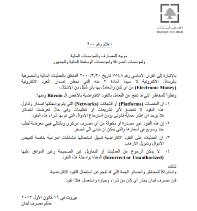 ويتبنى مصرف لبنان المركزي موقفًا صارمًا يهدف إلى عزل النظام المصرفي التقليدي عن مخاطرها، حيث تحظر تعاميمه على المصارف والمؤسسات المالية والمحافظ الإلكترونية المرخصة التعامل بها أو تسهيل شرائها. وكان مصرف لبنان قد حّذر في تعميم صدر عام 2013 من شراء وحيازة واستعمال النقود الافتراضية استدراكًا للمخاطر والخسائر الجمة التي قد تنجم عن ذلك. كما حظر اصدار النقود الإلكترونية والتعامل بھا بأي شكل من الأشكال.