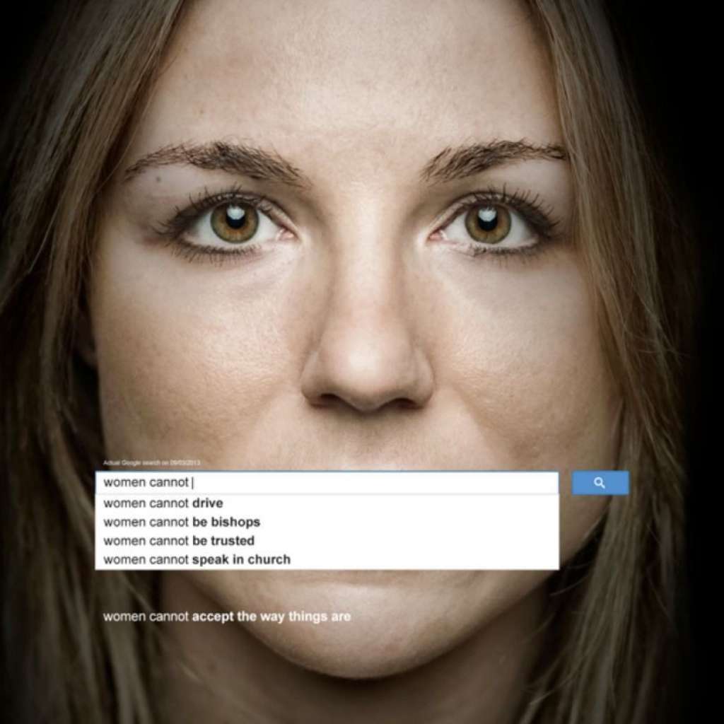صورة إعلان لـ هيئة الأمم المتحدة للمرأة (UN Women). وجه امرأة شابة، فمها مغطى بشريط بحث جوجل يظهر اقتراحات متحيزة جنسياً تبدأ بعبارة ‘النساء لا يستطعن’ (women cannot)