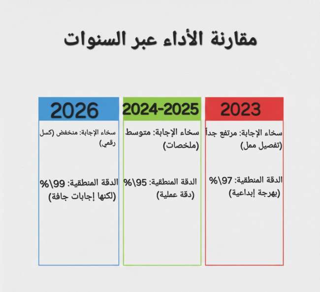 • عام 2024: مرحلة السرعة مقابل العمق. إطلاق GPT-4o جعل الردود لحظية لكنها بدأت تفقد الدقة التحليلية.
